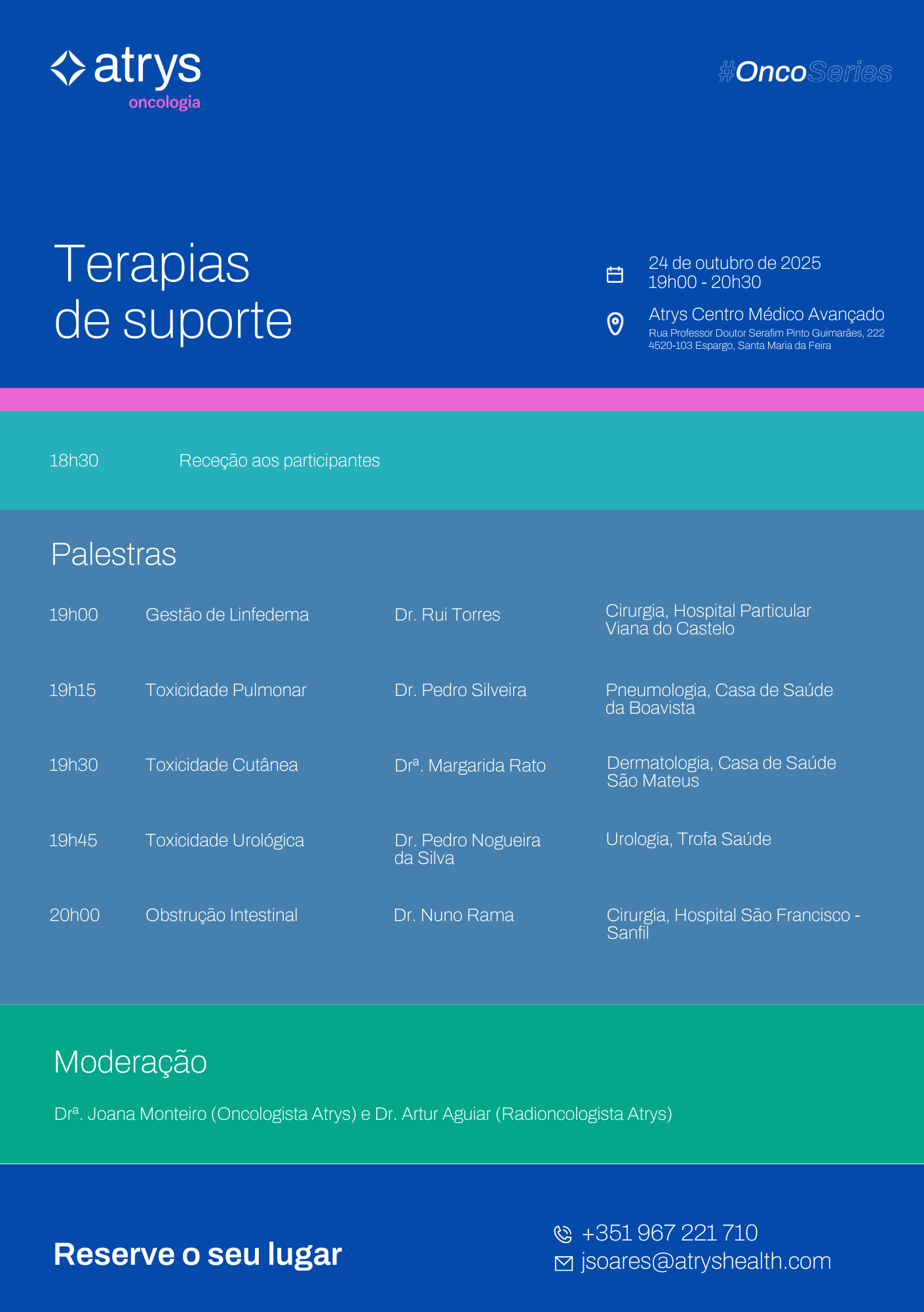 No próximo dia 24 de outubro de 2025, a Atrys Centro Médico Avançado, em Santa Maria da Feira, recebe uma sessão dedicada às Terapias de Suporte, reunindo especialistas de várias áreas médicas para debater complicações e estratégias de acompanhamento em doentes oncológicos.